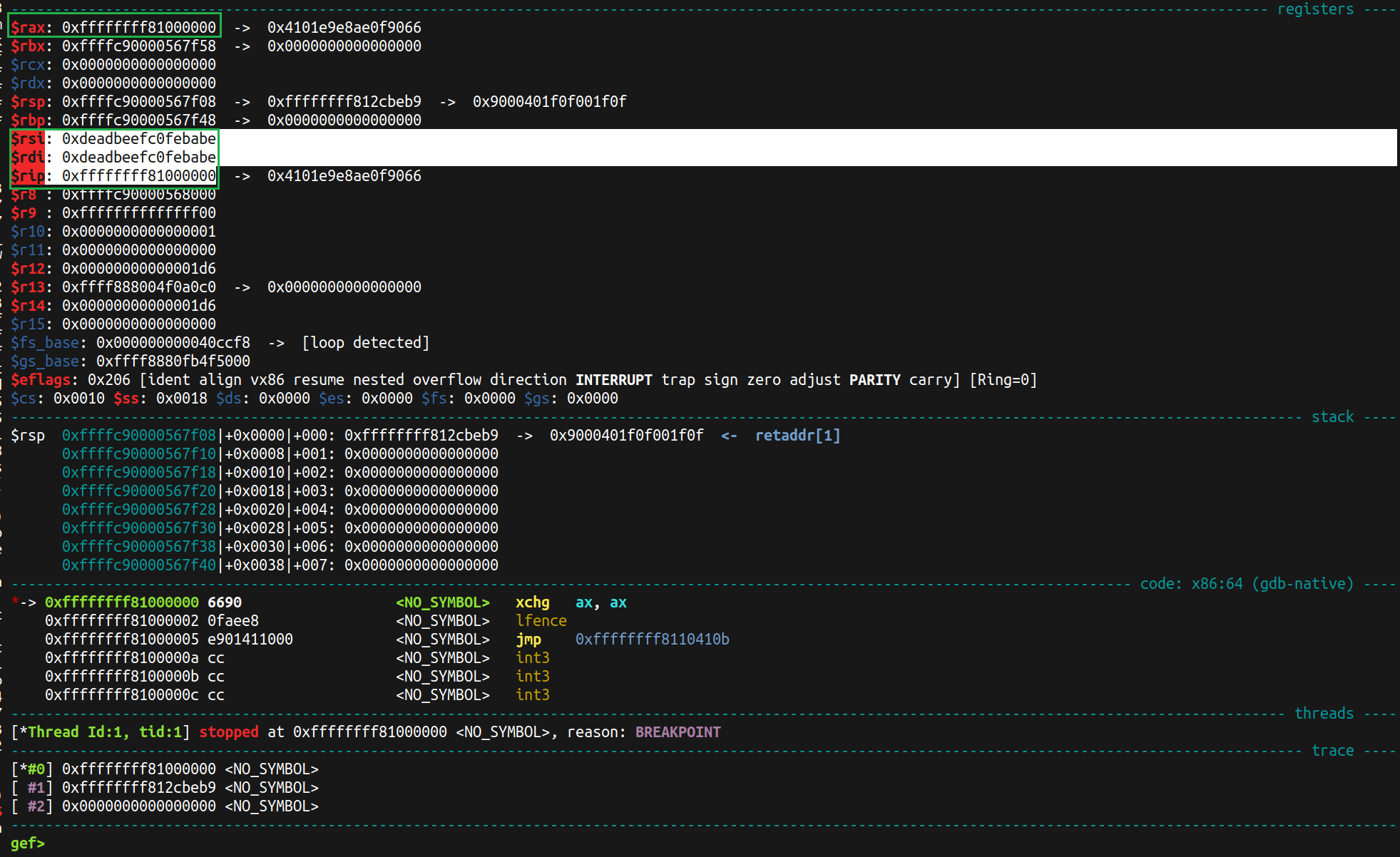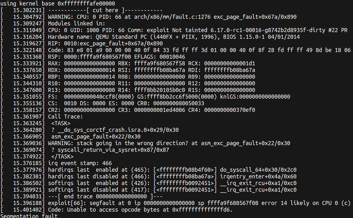 in page fault handler will be triggered and give us debug print with kernel heap addresses on regular registers and GS register.
